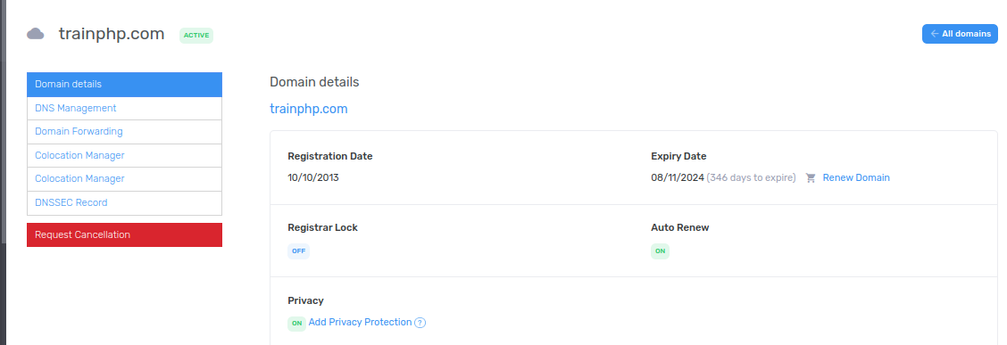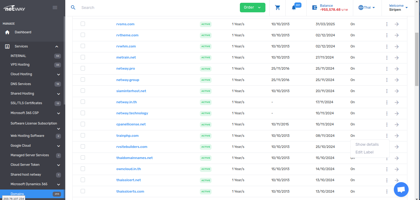 1. Login into the system at https://netway.co.th/clientarea/ Then select Services > Domain as shown in the picture and select the desired domain.