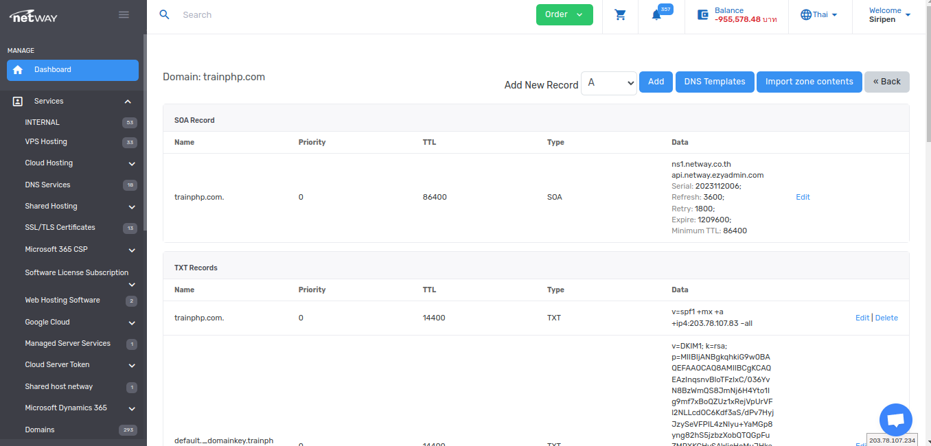 DNS Management is a management console for Nameserver. It allows such features as website hosting configuration, Google Workspace email configuration, or Microsoft 365 email configuration with the Nameserver hosted at Netway Communication. This concole affects the updates on your website directly. You should consult your technical team before changing anything in this console.