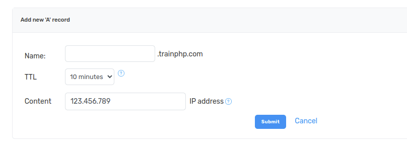 - สามารถเลือกค่าที่ต้องการได้จากเมนู Add New Record และกด Add หลังจากกด Add แล้วระบบจะให้ใส่ค่า Name , TTL , Content เมื่อกรอกเรียบร้อยแล้วให้กด Submit เพื่อเพิ่มค่าใหม่ที่ต้องการ