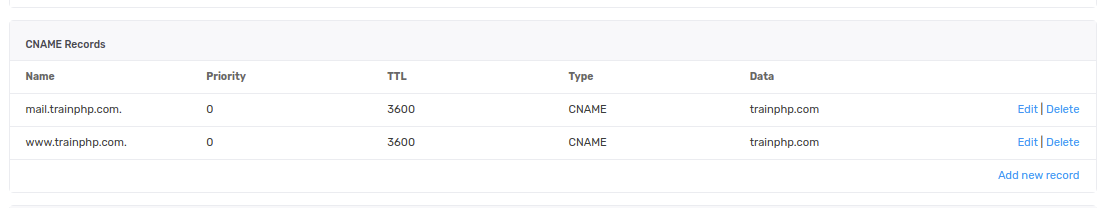- You can select the desired value from the Add New Record menu and press Add. After pressing Add, the system will prompt you to enter the values Name, TTL, Content. When completed, press Submit to add the desired new value.