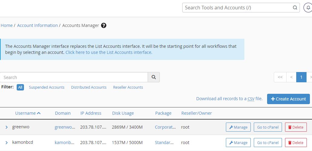 1. Accounts Manager - เป็นเมนูที่มาเเทน List Accounts แสดงอินเตอร์เฟซรายละเอียดทั้งหมดของเเต่ละโดเมน