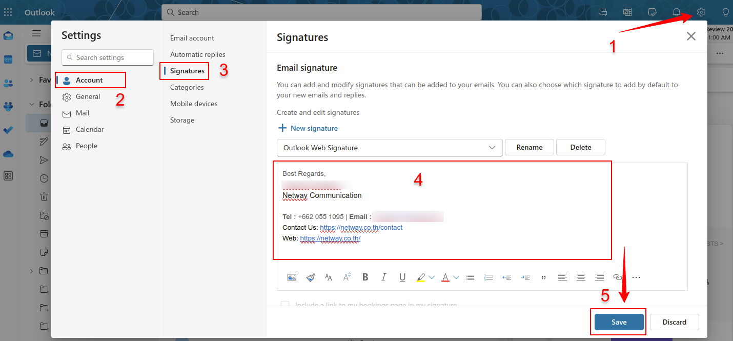 Email signature บน Outlook (Microsoft 365) คือ การระบุข้อมูลลายเซ็นในส่วนท้ายข้อความของอีเมล (Email) เพื่อยืนยันการมีตัวตนเพิ่มความน่าเชื่อถือและเป็นข้อมูลที่สามารถติดต่อกลับได้ เช่น คำลงท้ายอีเมล, ชื่อ, ตำแหน่ง, ชื่อบริษัท, เบอร์โทร, อีเมล อื่นๆ อีกทั้งยังสามารถปรับตัวอักษร ขนาด สี ตกแต่งรูปแบบต่างๆ และแทรกรูปขนาดเล็กได้