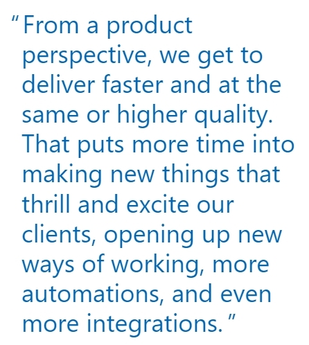 These internal benefits directly improve the client experience because Mastery can innovate quickly. “From a product perspective, we get to deliver faster and at the same or higher quality. That puts more time into making new things that thrill and excite our clients, opening up new ways of working, more automations, and even more integrations. What investment can you make today that makes your developers happier while accelerating dates?” says Cockrel.