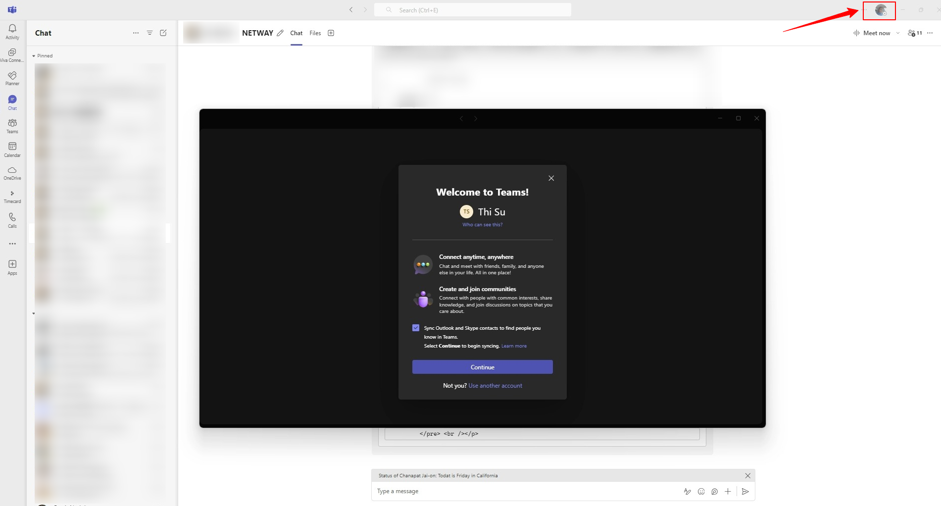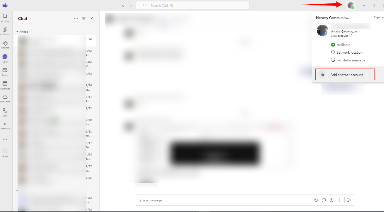 หากต้องการเพิ่มหรือเข้าใช้ account อื่นๆ ให้เลือกภาพโปรไฟล์ที่มุมขวาบน เมื่อลงชื่อเข้าใช้ Teams บัญชีงาน (Microsoft 365 Business), บัญชีส่วนตัว (Microsoft 365 Family หรือ Microsoft 365 Personal) สามารถสลับผู้ใช้ไป-มา ในแอป Teams ได้เลยโดยจะแสดงหน้าต่างซ้อนขึ้นมา