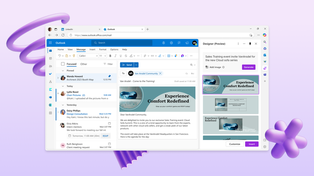 With Designer, all you need is an idea to create amazing images and designs. Just simply describe what you want to create and Designer uses AI powered by Dall-E 3 to generate great looking designs. You can even incorporate your own images, add text, and customize the results with simple commands to ensure you get just the image you’re looking for. It’s a tool anyone can use with confidence to add the right visual impact to their communications, presentations, and announcements.