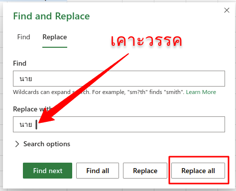 - Find and Replace คำว่า "นาย" และแทนที่ "นาย " (เว้นช่องว่างหลังคำว่า นาย)