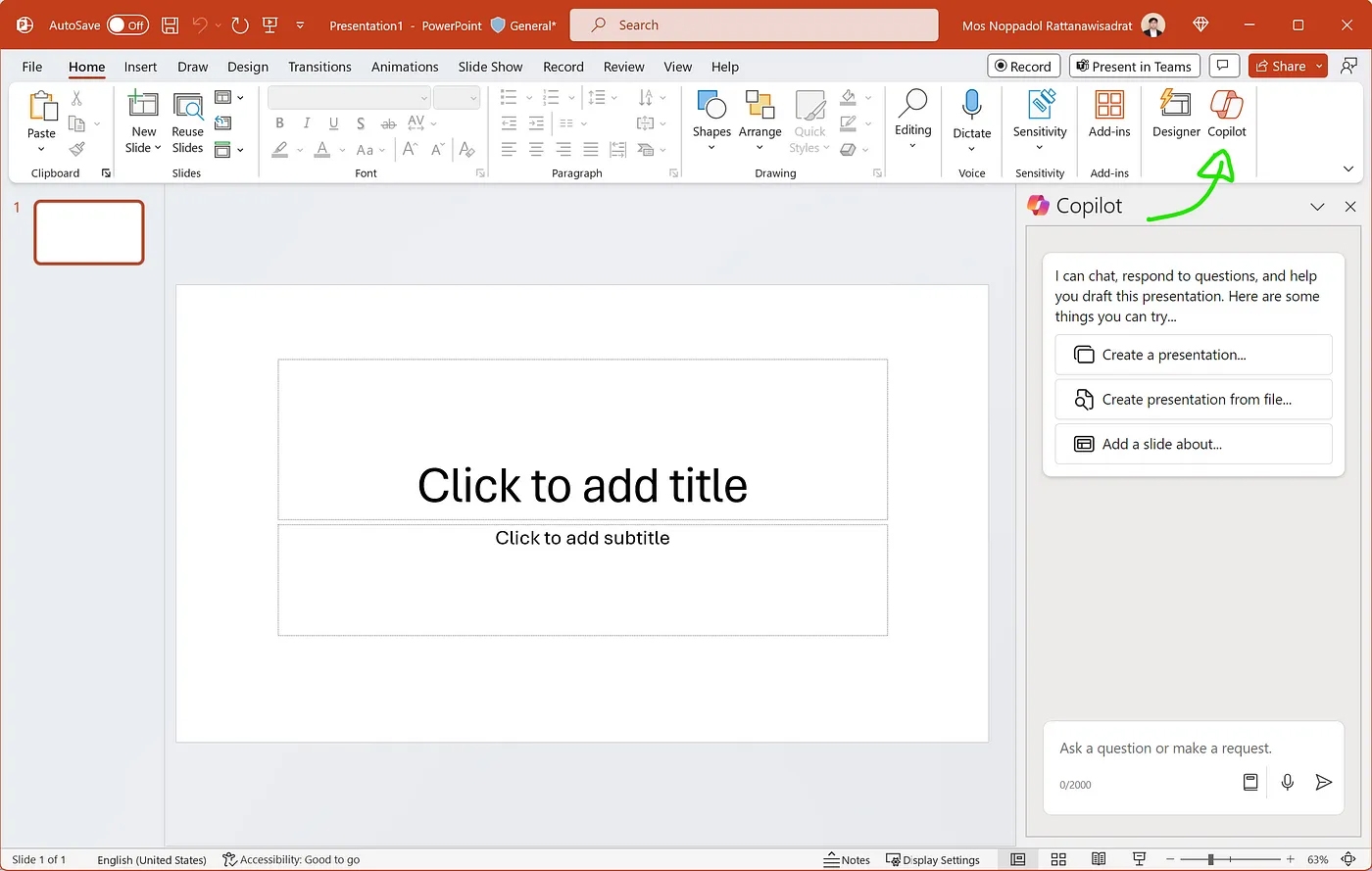 เปิดขึ้นมาจะเจอปุ่ม Copilot อยู่ด้านขวาบนซึ่ง