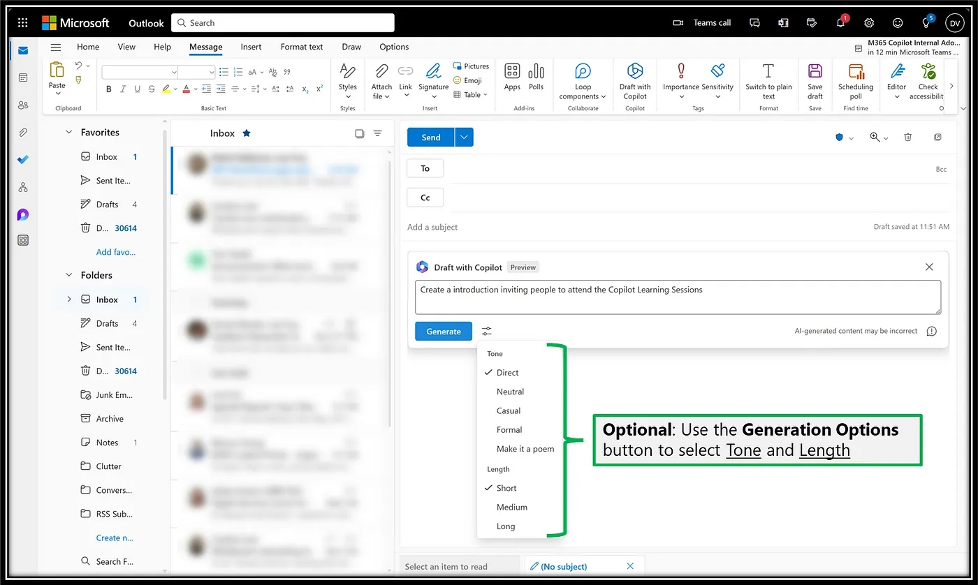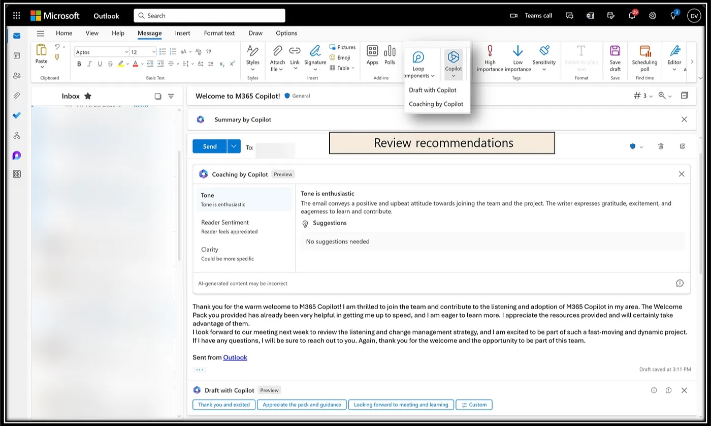 ปุ่ม Copilot จะเด้งขึ้นมาในหน้าที่จะเขียนเมลเลย หรือกดจากแถบเมนูด้านบนก็ได้
