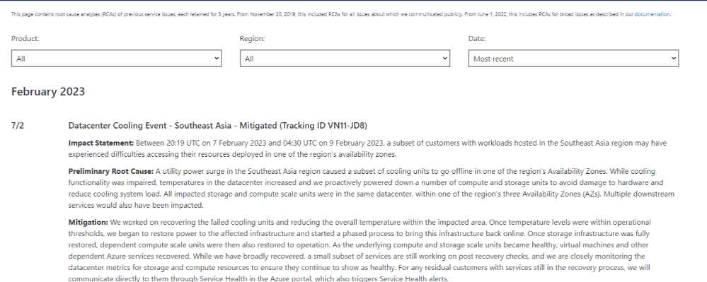 ล่าสุดเมื่อช่วงเช้าของวันที่ 9 ก.พ. 2023 ปัญหาเรื่อง Azure Datacenter Cooling Event ดังกล่าวเกิดจากกระแสไฟฟ้าขัดข้องที่ Microsoft Data Center ทำให้ระบบทำความเย็นบางส่วนไม่ทำงาน Microsoft จึงตัดสินใจปิดระบบบางส่วนเพื่อเลี่ยงความเสียหายของอุปกรณ์และข้อมูลลูกค้า โดยปัจจุบันปัญหาดังกล่าวได้รับการแก้ไขแล้ว