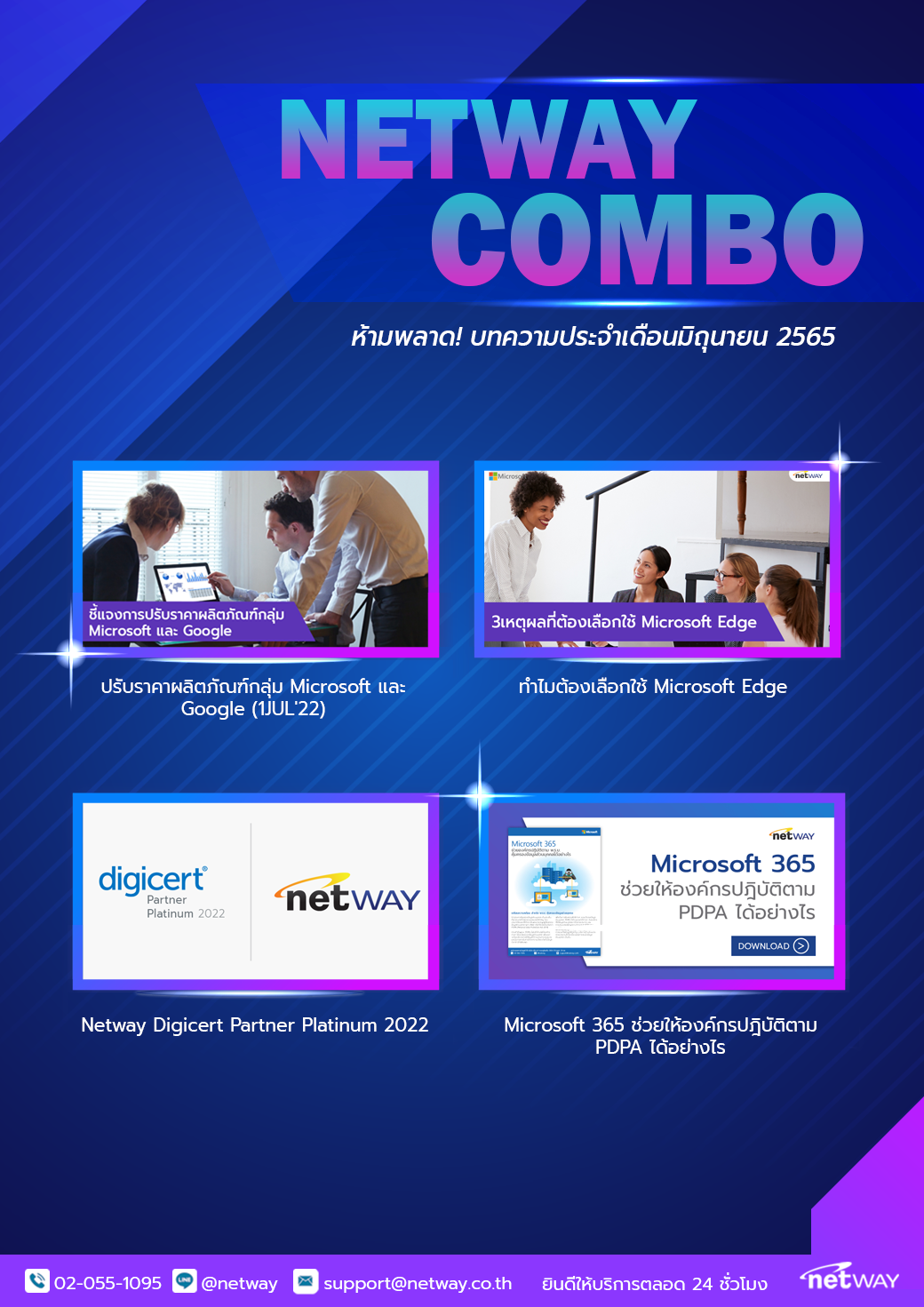 Netway คือ Authorized CSP Partner ของ Microsoft มีความเชี่ยวชาญทั้งการใช้งาน ติดตั้ง และบริการ พร้อมให้การสนับสนุนคุณแบบ 24x7