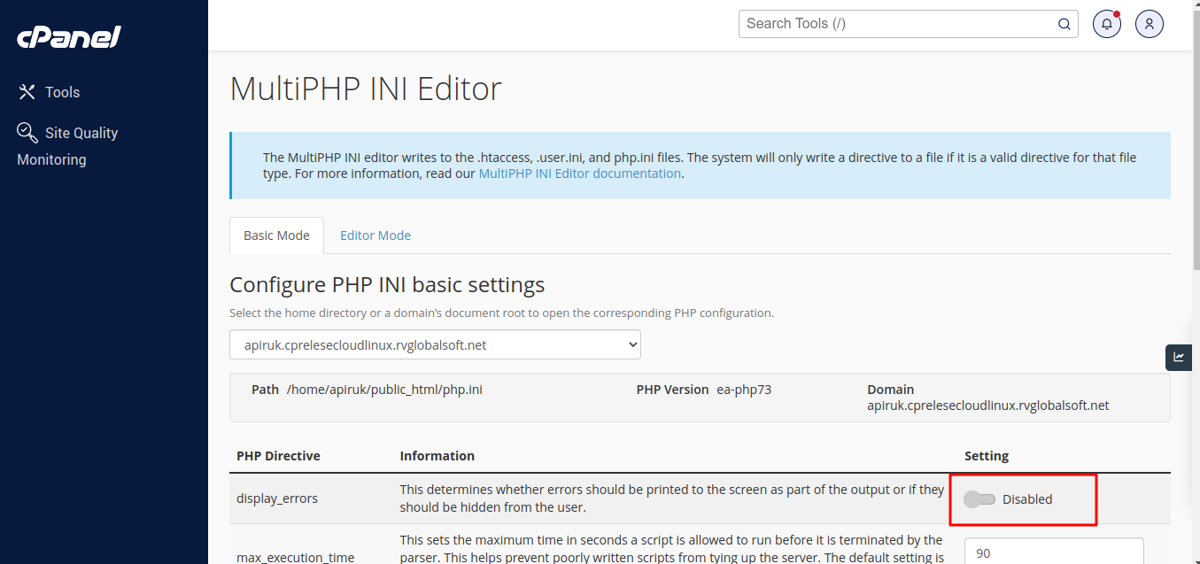 - เลือกโดเมนที่ต้องการตรวจสอบ -> click เปิด display_errors