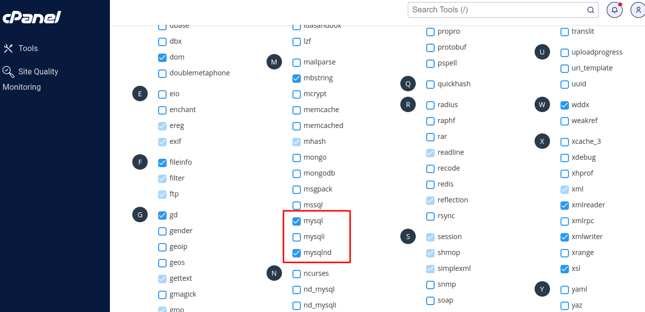 - ไปที่ Control panel -> PHP Selector -> Extensions select mysql,mysqlnd
