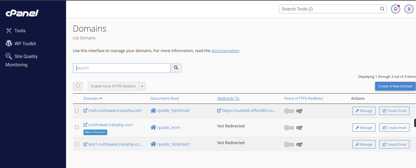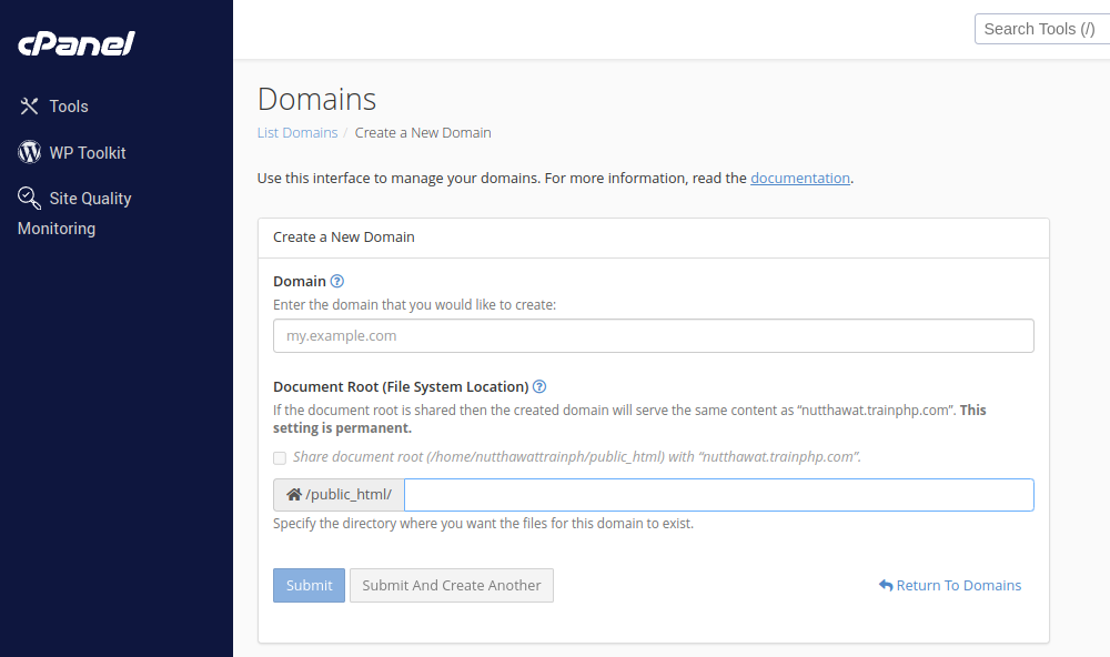 สำหรับผู้ที่ใช้งาน cPanel Hosting สามารถจัดการจัดการข้อมูลต่างๆ ได้เช่นการสร้างโดเมนย่อย, เพิ่มโดเมนใหม่, เปลี่ยนเส้นทางเว็บไซต์ และอื่นได้อีกมากมาย