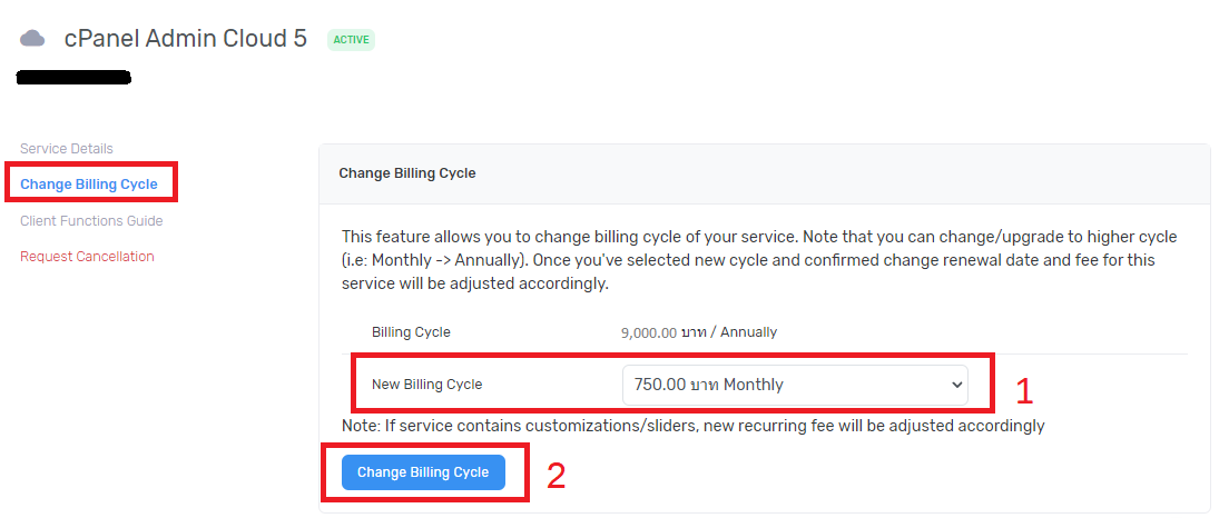 New Billing Cycle หมายถึง ส่วนปรับเปลี่ยนรอบบิล โดยสามารถคลิกเลือกได้ที่ลูกศร เมื่อเลือกแล้ว คลิก Change Billing Cycle (หมายเลข 2 ในภาพประกอบ) เพื่อยืนยัน