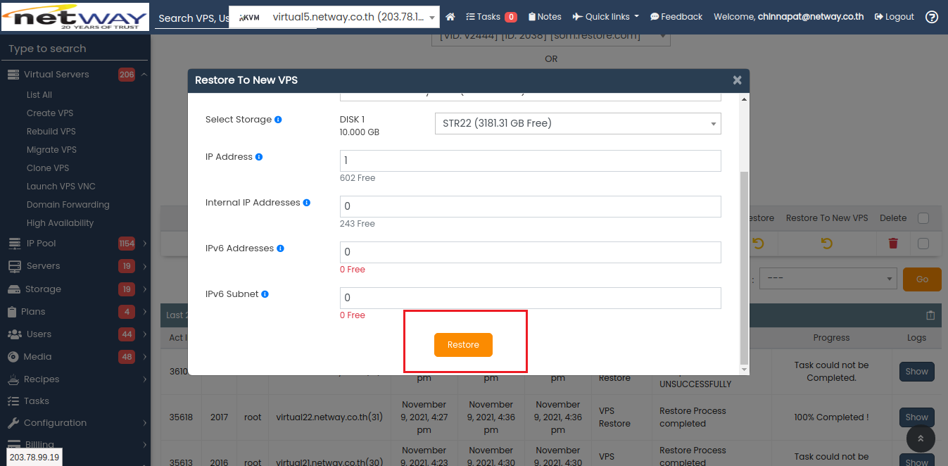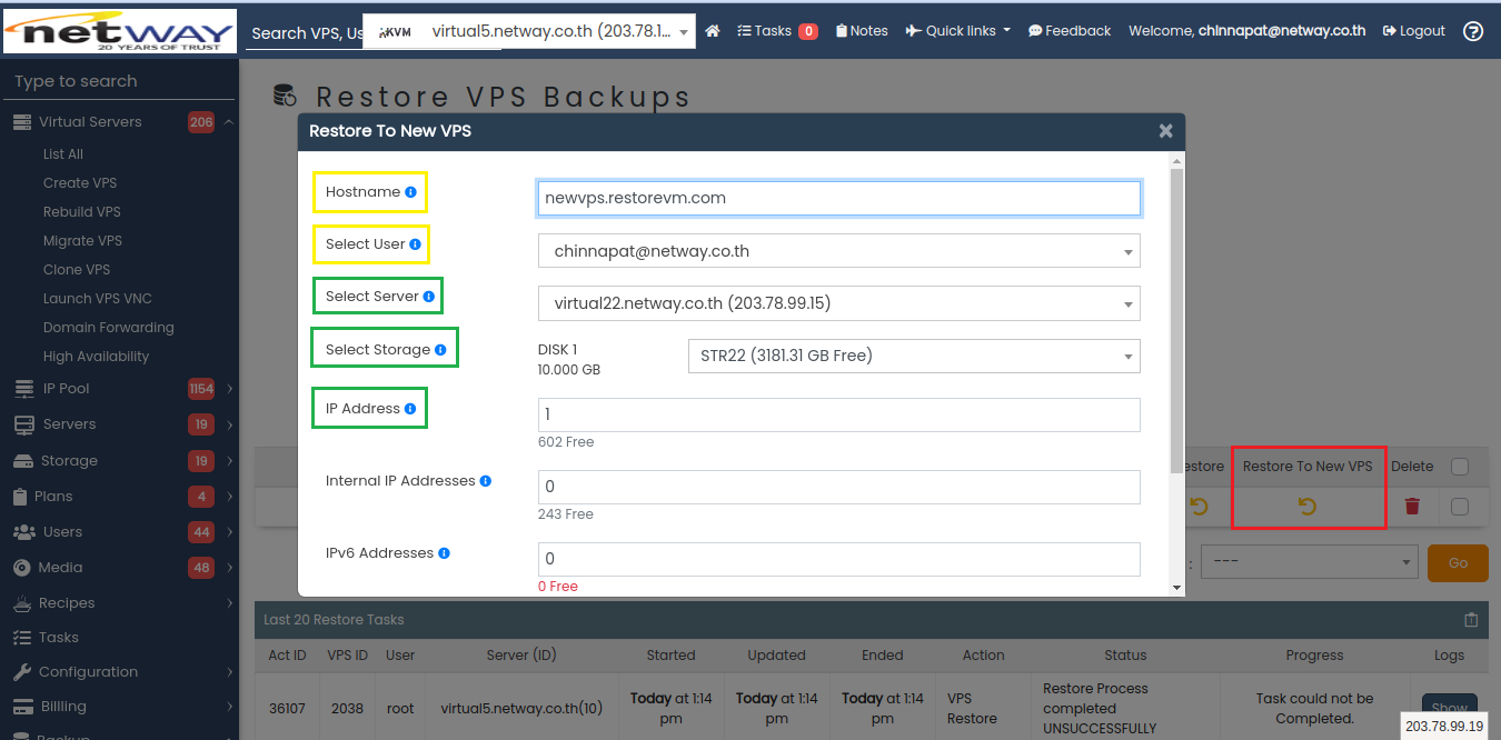- Restore To New VPS ใช้ในกรณีที่ต้องการจะ Restore VM เป็น New VPS