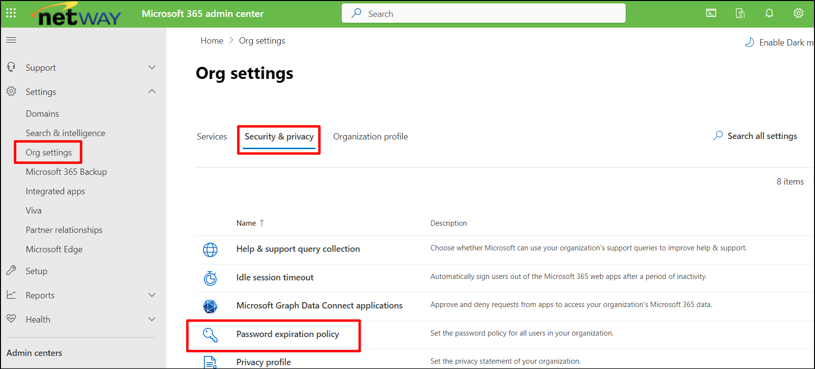 ค่ามาตรฐานของ Microsoft 365 ระบบจะตั้งค่ามาตรฐานให้มีการเปลี่ยน Password ตามจำนวนวันที่กำหนดไว้ หากลูกค้า ต้องการยกเลิก หรือกำหนดวันในการบังคับเปลี่ยน Password สามารถทำได้ โดย login เข้าสู่ระบบในสิทธิ์ Microsoft 365 Global Admin >> Org settings แล้วไปที่ Security & privacy tab แล้วทำการแก้ไขในส่วน Password expiration policy ตามต้องการ