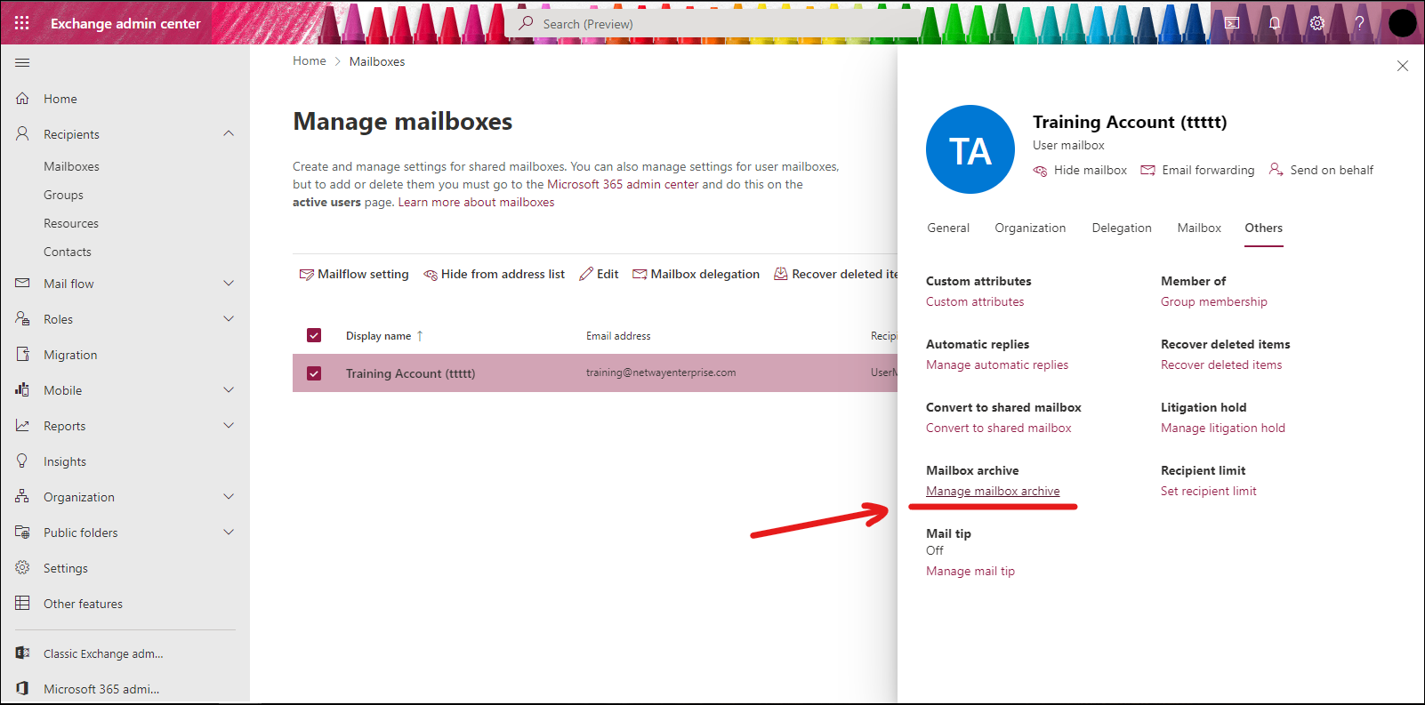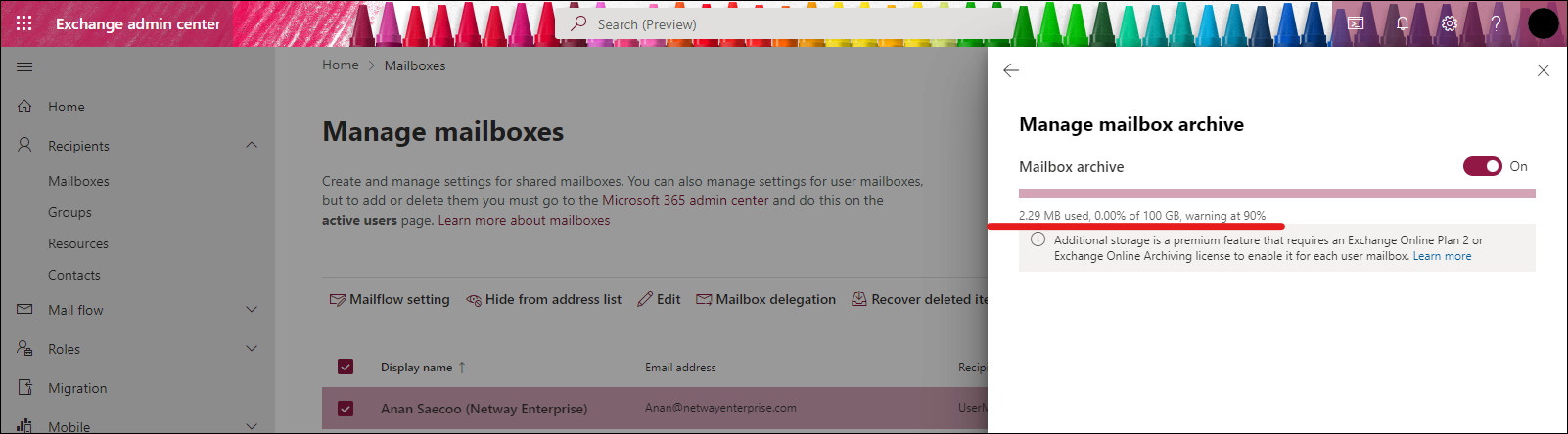 โดยปกติขนาด Mailbox ของ Microsoft 365 Exchange plan จะมีขนาดเริ่มต้นที่ 50GB. แต่ในบางกรณีผู้ใช้งานจำเป็นต้องใช้เพิ่มเติม ผู้ดูแลระบบจำเป็นจะต้องเข้าไปเปิดด้วยตนเอง เนื่องจาก Feature In-Place Archive จะไม่ได้ถูกเปิดใช้งานตั้งแต่ต้น