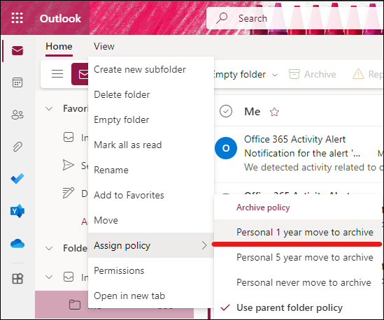 เมื่อเปิดใช้งาน In-Place Archive สำหรับผู้ใช้งานใดแล้ว ผู้ใช้งานนั้นๆ จะสามารถตั้งค่า Archive policy ให้กับ Folder ย่อยได้ โดยเป็นการบังคับให้ Archive อัตโนมัติ นอกเหนือจาก Default policy (กฏตั้งต้นอยู่ที่ 2 ปี จะทำการ Archive อัตโนมัติ)