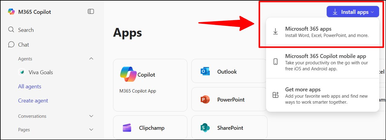 2. ให้เลือก Install apps >> Microsoft 365 Apps เพิ่มทำการดาวน์โหลดไฟล์ติดตั้ง