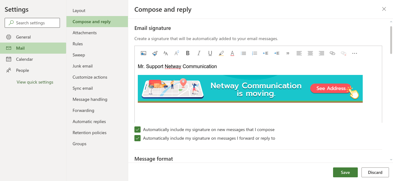 > ดูการตั้งค่า ใน Outlook ทั้งหมด > เขียนและตอบกลับ (Compose and Reply)