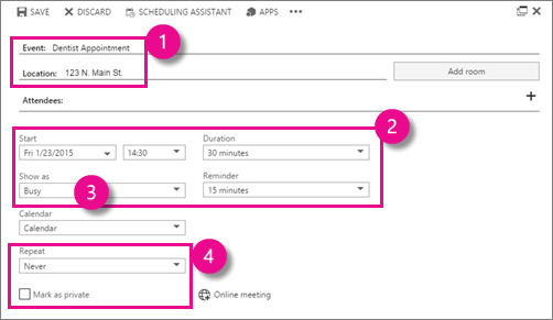 Add meetings, appointments, and other events to your calendar in Outlook Web App and track and share with others.