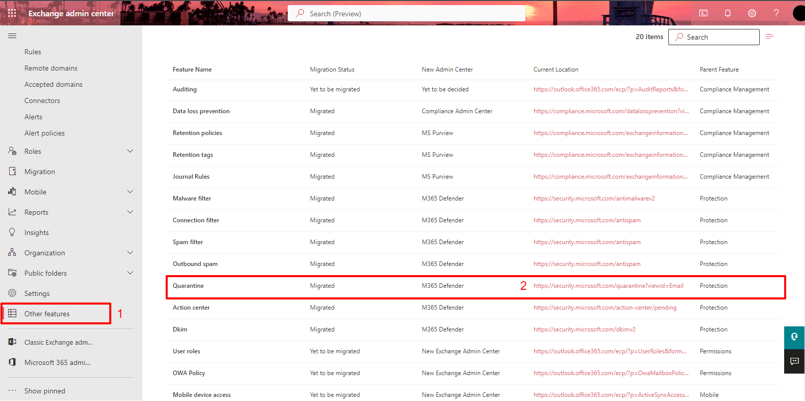 2. ที่เมนูด้านซ้าย เลือกเมนู Other features และไปที่ Quarantine
