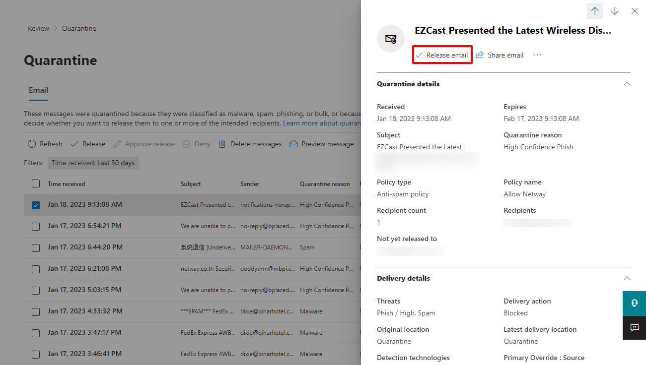 4. ในการ Release หรือปล่อย Email เข้าสู่ระบบภายใน จะมีตัวเลือกว่าให้ส่งเข้าไปที่ใครบ้าง ให้คัดลอกข้อความไปที่ใครหรือไม่ และสุดท้าย ให้ส่งรายละเอียดไปทาง Microsoft หรือไม่ เพื่อแจ้งว่าเป็นการตรวจจับที่ผิดพลาดหรือไม่