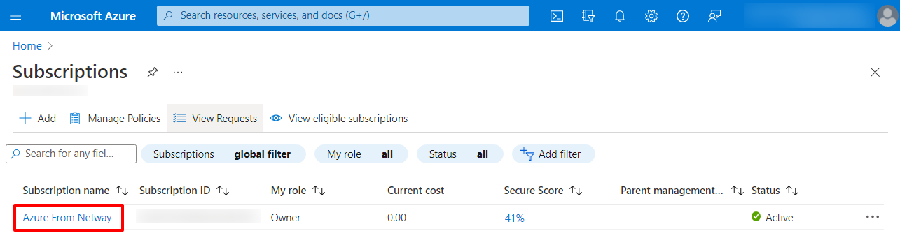 3. ทำการเลือก Subscription ที่ต้องการ กรณีหากสั่งซื้อกับทางเน็ตเวย์ ค่าเริ่มต้นที่ทางเน็ตเวย์กำหนดไว้คือ Azure From Netway